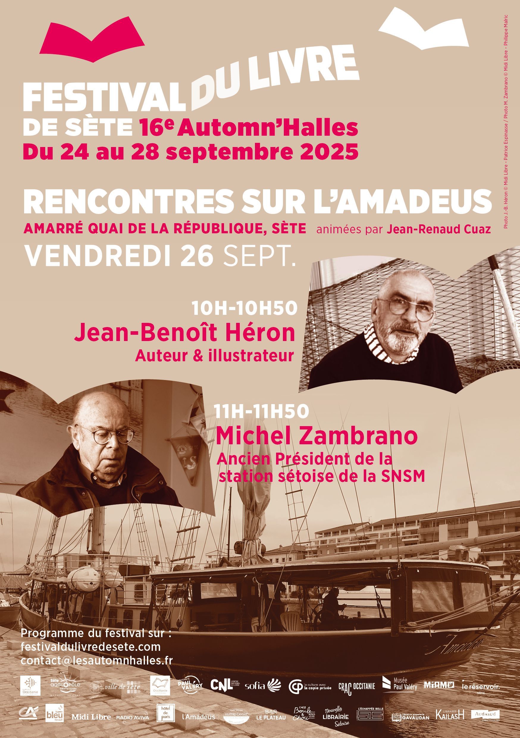 Michel Zambrano, auteur d’éloquents Embruns de vie illustrés par Pierre Lesc (Éd. Flam 2013), n’avait pu évoquer sa carrière maritime pour les Automn’Halles 2024, alerté pour superviser en hâte un sauvetage en mer. L’ancien président de la station SNSM de Sète (durant 37 ans… record de longévité), nouveau Commandeur de l’ordre du mérite maritime, fera vivre sous nos yeux ces canots tous temps décrits plus tôt par Jean-Benoît Héron. Il en aura connu trois, un autre record. Une matinée à bord du plus vieux gréement du port de Sète, un ancien morutier qui vient de souffler ses 115 bougies, paisiblement amarré entre les ponts de Tivoli et de la Victoire.