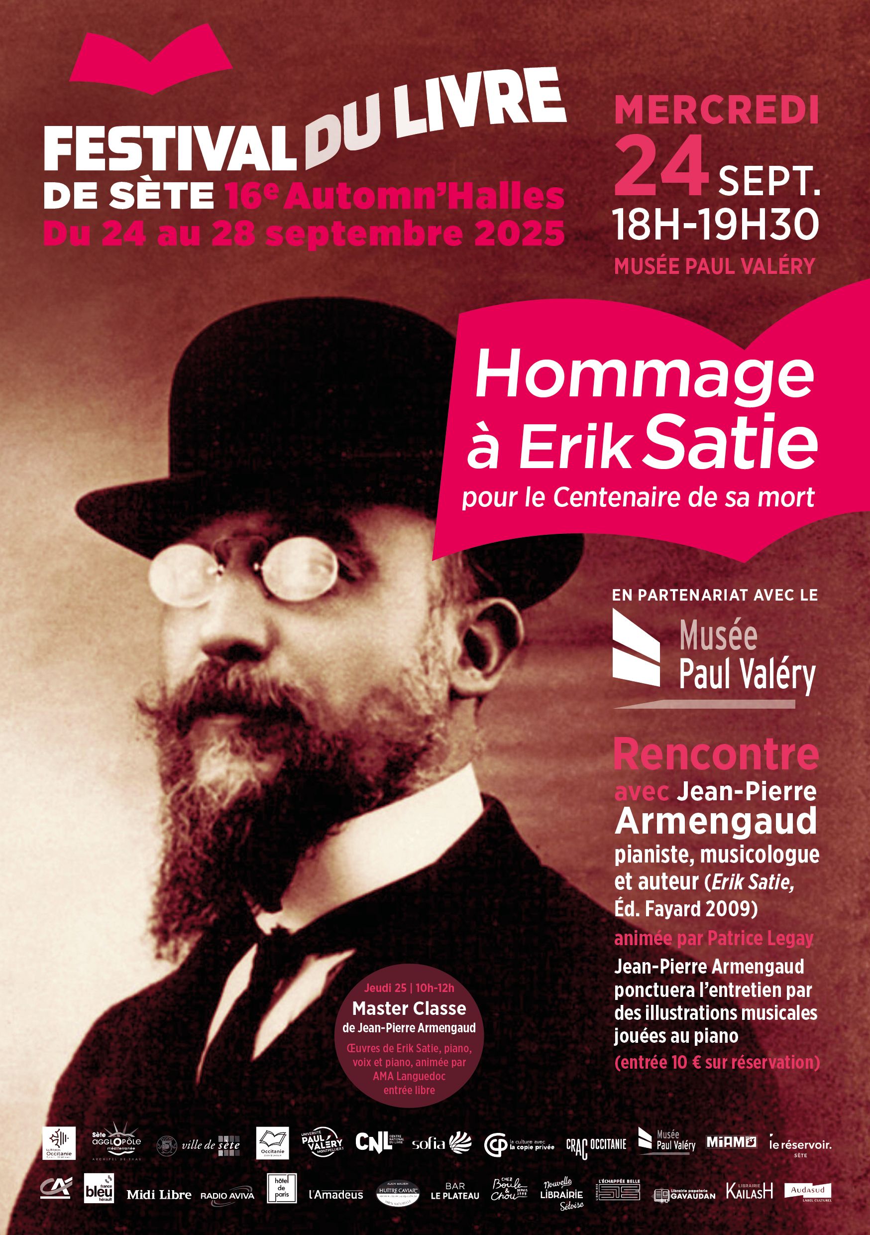 La soirée d’ouverture des Automn’Halles est l’occasion d’honorer un écrivain, un compositeur, un artiste… En 2024, année du centenaire de la mort de l’écrivain pragois Franz Kafka, le musée Paul Valéry accueillait une rencontre autour du Verdict. Cette année, en hommage à Erik Satie disparu il y a cent ans, c’est Jean-Pierre Armengaud, pianiste, musicologue et auteur de la biographie Erik Satie (Éd. Fayard) qui évoquera l’œuvre du compositeur avec le musicien Patrice Legay. L’entretien sera ponctué par des illustrations musicales jouées au piano*. Le lendemain, Jean-Pierre Armengaud conduira une master classe avec des œuvres de Satie, voix et piano, animée par AMA Languedoc (entrée libre).
